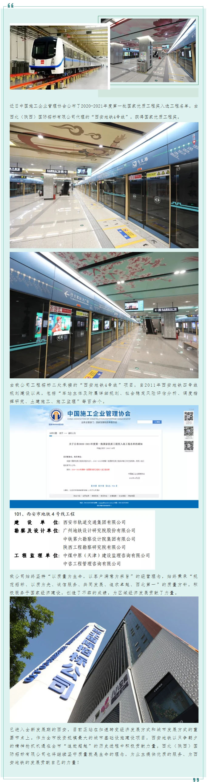 由西北國(guó)際招標(biāo)公司代理的“西安地鐵4號(hào)線工程”榮獲國(guó)家優(yōu)質(zhì)工程獎(jiǎng)