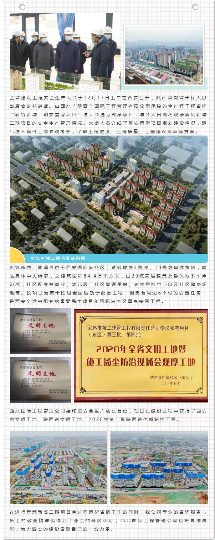 我公司承接全過程工程咨詢“新筑新城二期安置房項(xiàng)目”被全省建設(shè)工程安全生產(chǎn)大會(huì)選為觀摩項(xiàng)目,陜西省副省長徐大彤蒞臨參觀考察