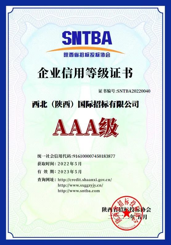 熱烈祝賀我公司榮獲2022年陜西省招投標協(xié)會《AAA級企業(yè)信用等級證書》
