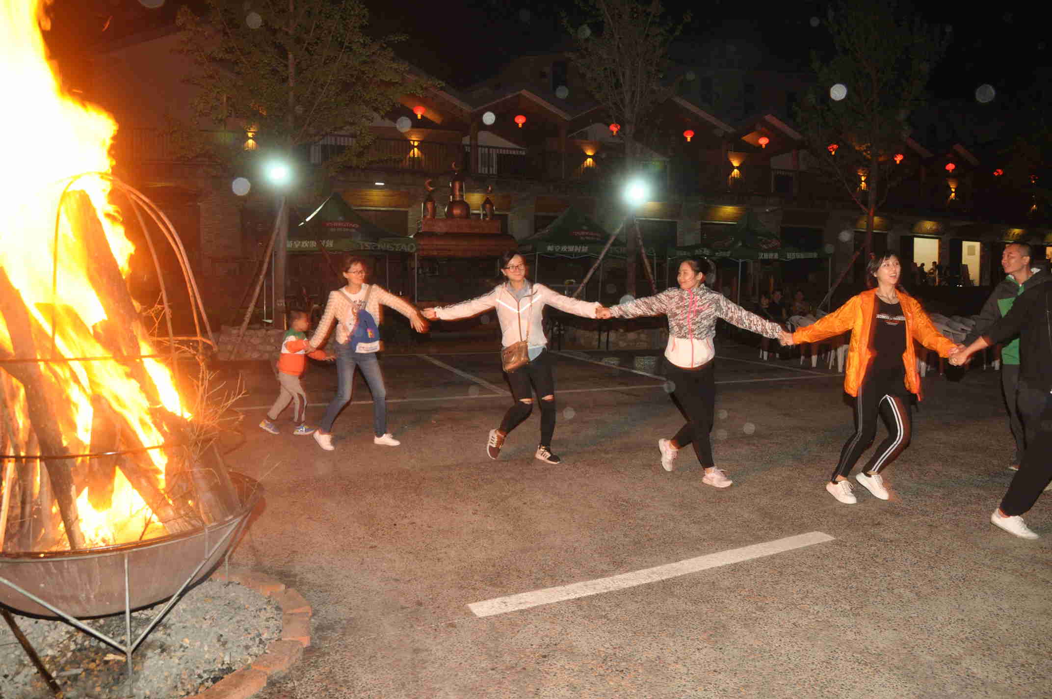 夜幕降臨,酒店外的廣場(chǎng)上點(diǎn)起篝火,大家紛紛都聚集到篝火旁,在主持人的帶動(dòng)下,手拉著手一起又唱又跳。
