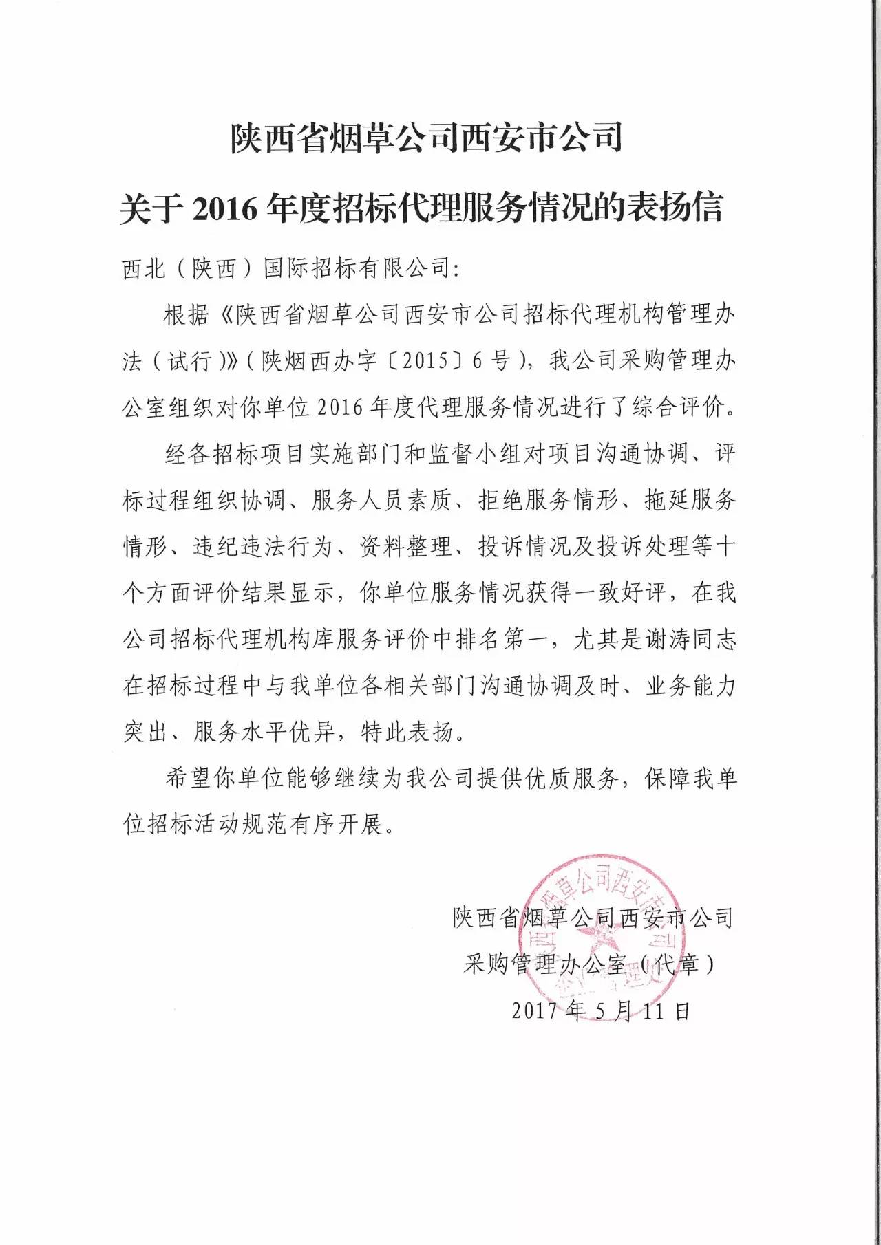 近日,我公司收到陜西省煙草公司西安市公司發(fā)來的表揚信。經(jīng)過綜合評價,我公司被評為西安市煙草公司2016年度招標代理服務(wù)評價第一名。對我公司代理服務(wù)給予積極評價,對謝濤同志的工作給予熱情肯定!