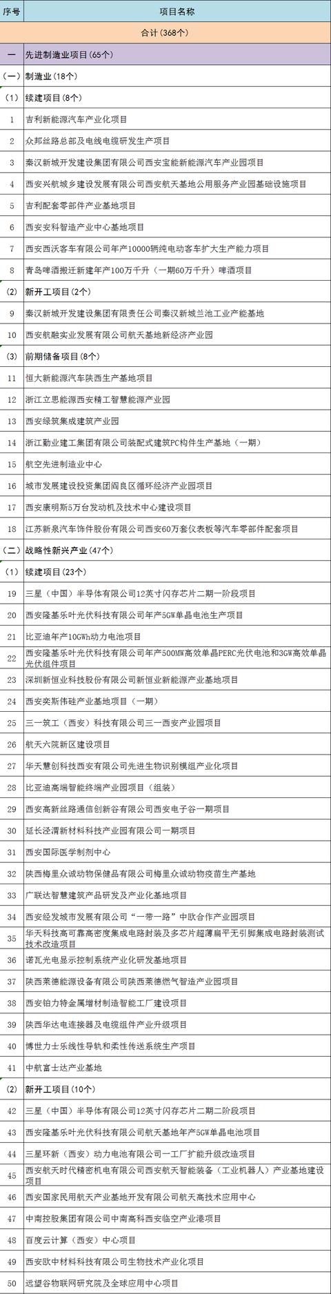 近日,西安市2020年市級重點項目名單發(fā)布。2020年西安市共安排368個重點項目,其中先進制造業(yè)項目65個,包含制造業(yè)項目18個、戰(zhàn)略性新興產(chǎn)業(yè)項目47個;服務業(yè)項目110個,包含商貿(mào)城市綜合體項目65個、物流會展科技服務項目45個;文化旅游產(chǎn)業(yè)項目23個,包含文化產(chǎn)業(yè)項目15個、旅游產(chǎn)業(yè)項目8個;城建及基礎設施項目50個,包含電力供氣項目7個、機場鐵路地鐵道路項目43個;生態(tài)環(huán)保項目29個,包含垃圾處理項目3個、治水項目21個、治綠項目5個;社會事業(yè)和民生保障項目91個,包含教育項目22個、體育衛(wèi)生項目34個、老舊小區(qū)改造和背街小巷改造項目8個、安置房建設項目23個、其他項目4個,具體名單如下。